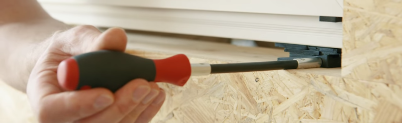 Nach Stand der Technik das Fenster diagonal seitlich mit dem FlexKeil 13 verklotzen. Den FlexKeil 13 auf den FlexKeil-Driver schieben, in die seitliche Öffnung einführen und in der Höhe verstellen, bis der Keil festsitzt. Somit ist für eine dauerhafte Lastabtragung in Sekundenschnelle gesorgt.
